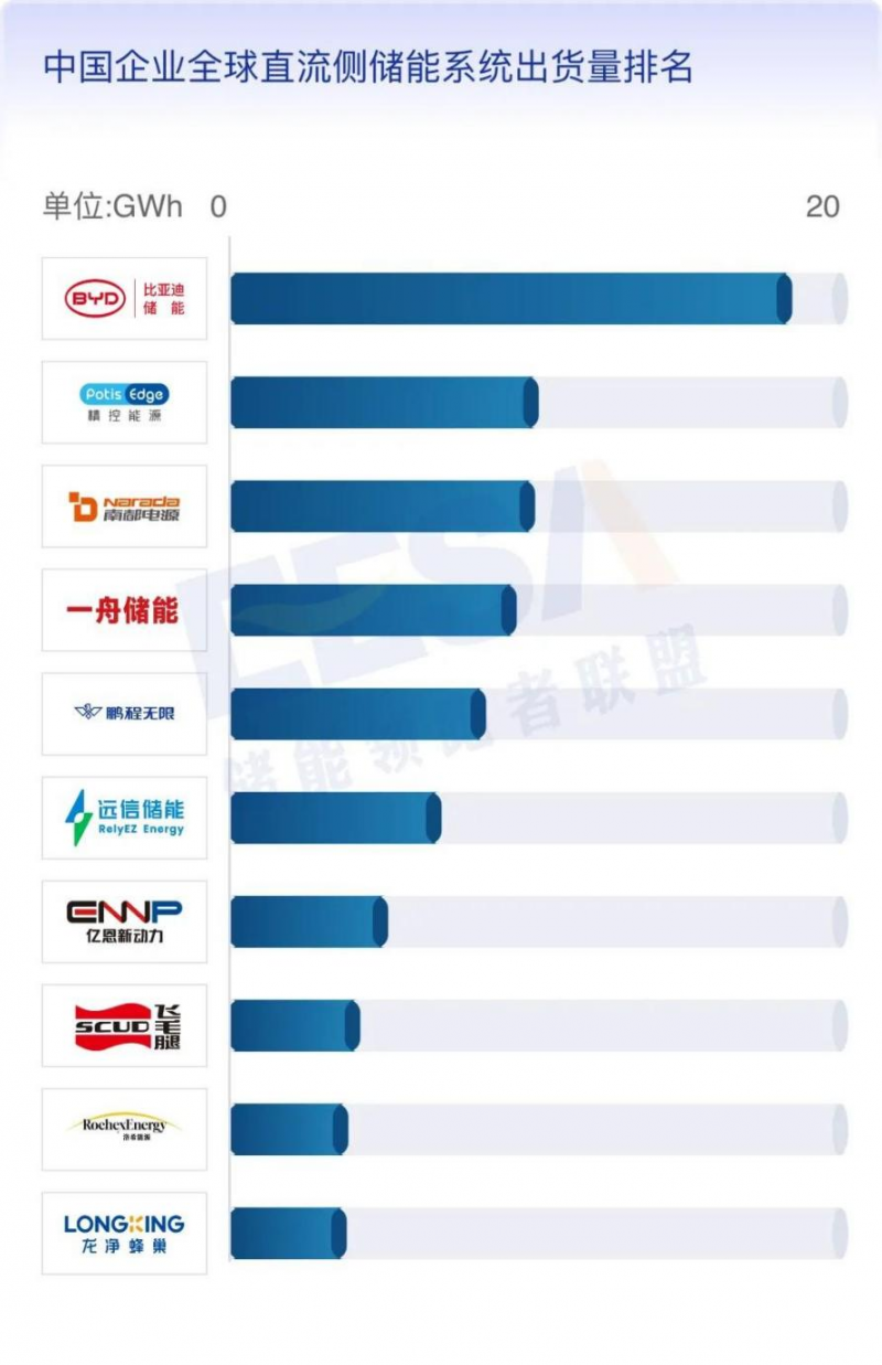 2024年度,在中國企業全球直流側儲能系統解決方案提供商中,出貨量排名前十的中國企業依次為:比亞迪儲能、精控能源、南都電源、一舟儲能、鵬程無限、遠信儲能、億恩新動力、飛毛腿、洛希能源、龍凈蜂巢。