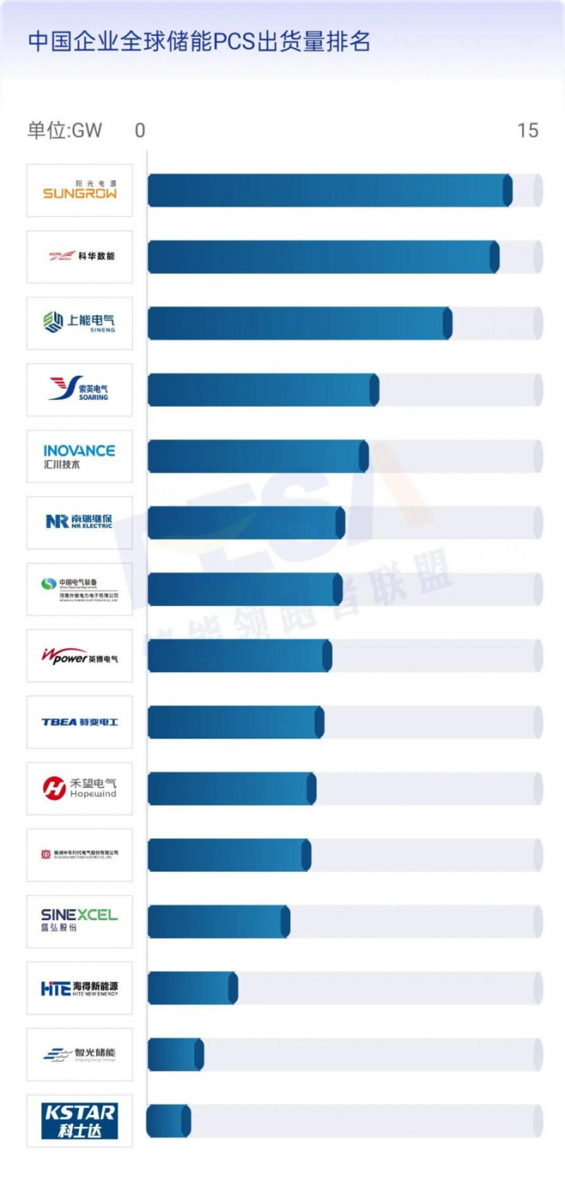 2024年度,在中國企業全球儲能PCS出貨量排名中,出貨量排名前十五的中國儲能企業依次為:陽光電源、科華數能、上能電氣、索英電氣、匯川技術、南瑞繼保、許繼電力電子公司、英博電氣、特變電工、禾望電氣、中車時代電氣、盛弘股份、海得新能源、智光儲能、KSTAR科士達。