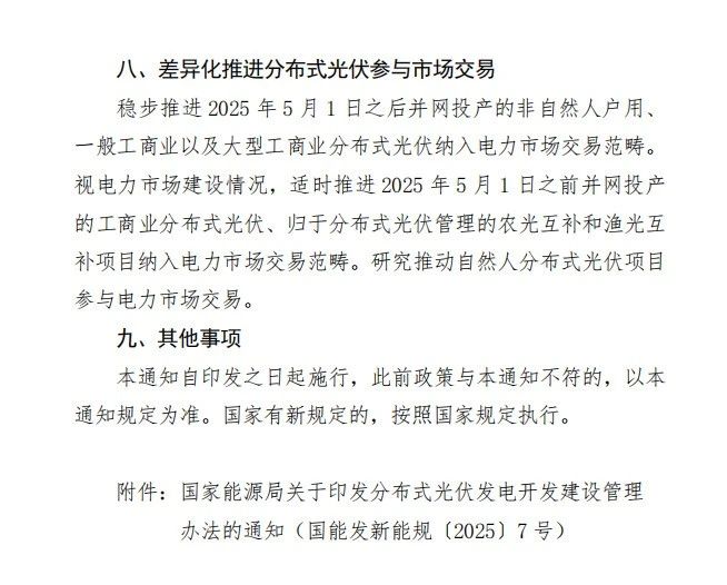 《征求意見稿》還指出,差異化推進分布式光伏參與市場交易。穩步推進2025年5月1日之后并網投產的非自然人戶用、一般工商業以及大型工商業分布式光伏納入電力市場交易范疇。視電力市場建設情況,適時推進2025年5月1日之前并網投產的工商業分布式光伏、歸于分布式光伏管理的農光互補和漁光互補項目納入電力市場交易范疇。研究推動自然人分布式光伏項目參與電力市場交易。