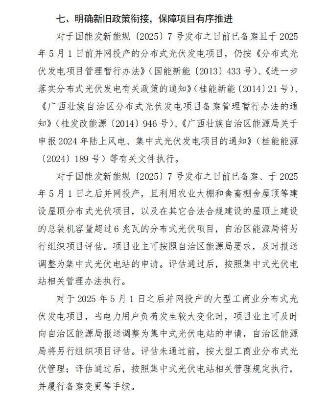 對于國能發新能規〔2025〕7號發布之日前已備案、于2025年5月1日之后并網投產,且利用農業大棚和禽畜棚舍屋頂等建設屋頂分布式光伏項目,以及在其它合法合規建設的屋頂上建設的總裝機容量超過6兆瓦的分布式光伏項目,自治區能源局將另行組織項目評估。項目業主可按照自治區能源局要求,及時報送調整為集中式光伏電站的申請。評估通過后,按照集中式光伏電站相關管理辦法執行。