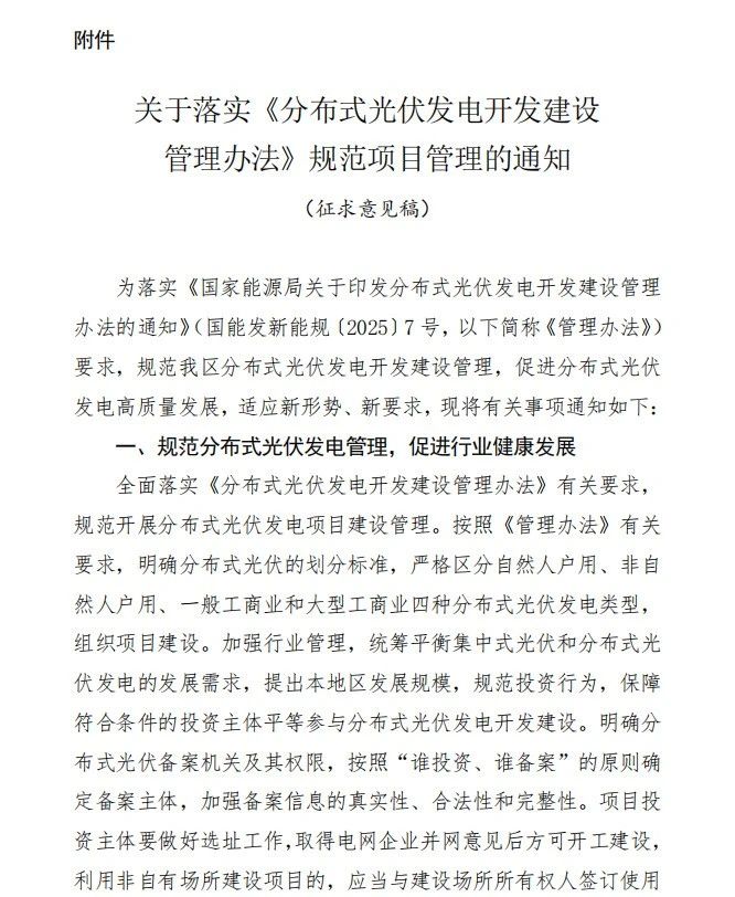 據征求意見稿內容顯示,文件明確上網模式,實行差異化管理。分布式光伏發電上網模式包括全額上網、全部自發自用、自發自用余電上網三種。自然人戶用、非自然人戶用分布式光伏可選擇全額上網、全部自發自用或者自發自用余電上網模式。其中,一般工商業分布式光伏可選擇全部自發自用或者自發自用余電上網模式;采用自發自用余電上網的,年自發自用電量占發電量的比例不低于50%,連續三年年自發自用電量占比低于50%的項目,轉為全部自發自用模式。