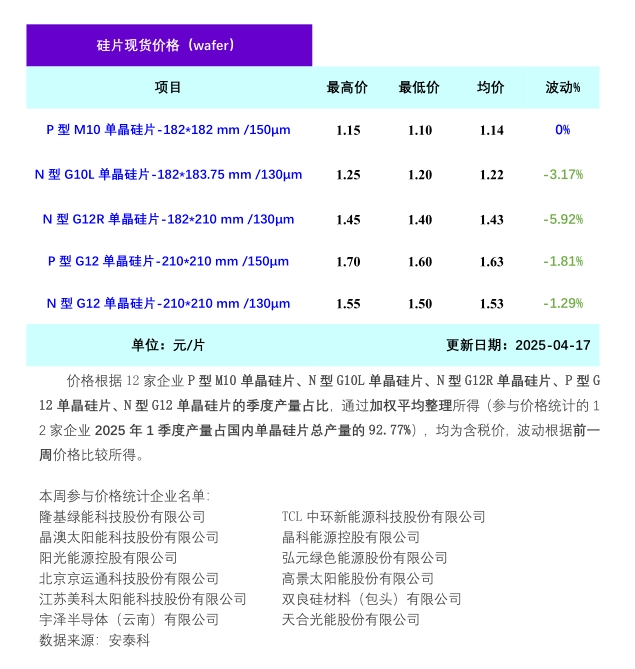 本周硅片價格大幅下跌,其中N型G10L單晶硅片(182*183.75mm/130μm/256mm)成交均價在1.22元/片,周環比跌幅3.17%;N型G12R單晶硅片(182*210mm/130μm)成交均價在1.43元/片,周環比跌幅5.92%;P型G12單晶硅片(210*210mm/150um)成交均價在1.63元/片,周環比跌幅1.81%;N型G12單晶硅片(210*210mm/150μm)成交均價在1.53元/片,周環比跌幅1.29%。本周上下游看跌后市情緒較為濃厚,部分企業恐慌性低價出貨,硅片價格繼續下行。