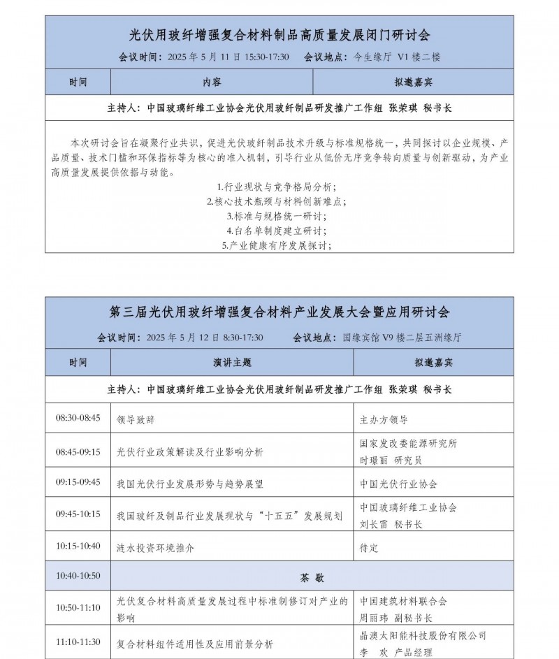 為打破內(nèi)卷困局,加強企業(yè)在技術(shù)升級與成本優(yōu)化、標準引領(lǐng)與市場拓展等方面的溝通與戰(zhàn)略協(xié)同,中國玻璃纖維工業(yè)協(xié)會聯(lián)合中國光伏行業(yè)協(xié)會定于2025年5月11~13日在江蘇省漣水縣組織召開第三屆光伏用玻纖增強復(fù)合材料產(chǎn)業(yè)發(fā)展大會暨應(yīng)用研討會。歡迎各位踴躍報名參會。