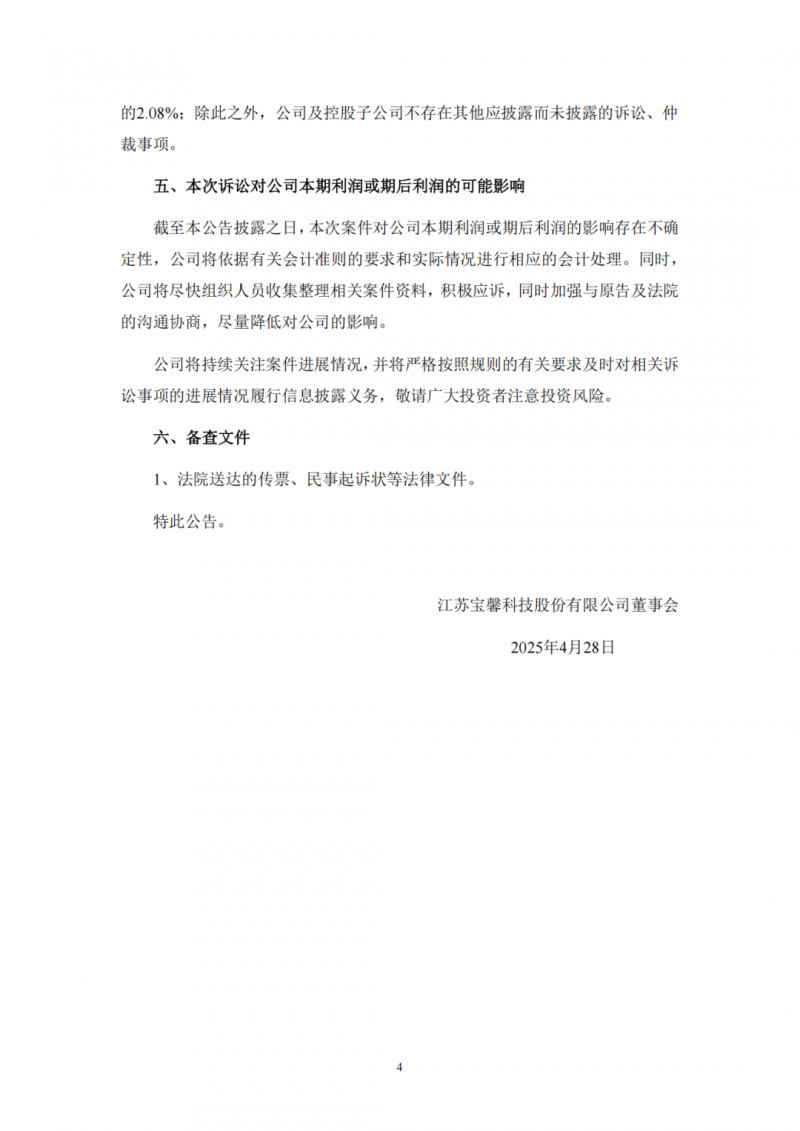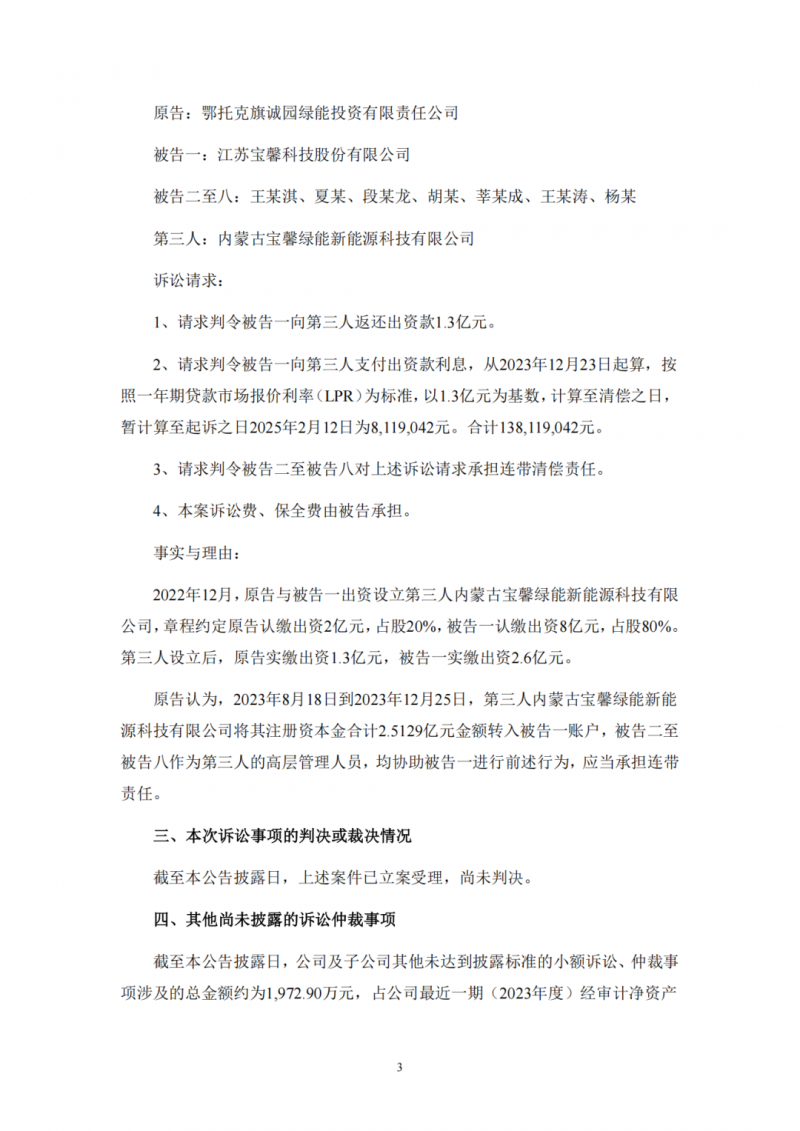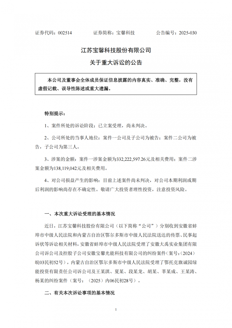 公告顯示,近日寶馨科技分別收到安徽省蚌埠市中級人民法院和內蒙古自治區鄂爾多斯市中級人民法院送達的傳票、民事起訴狀等訴訟相關材料。