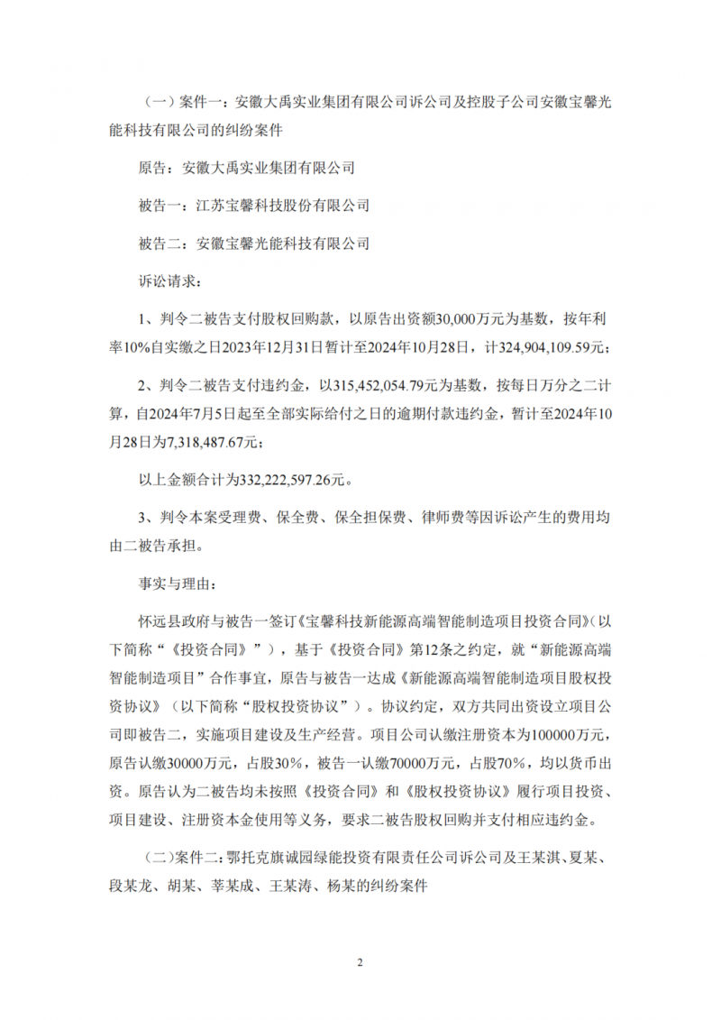 其中,安徽省蚌埠市中級人民法院受理的是安徽大禹實業集團有限公司訴公司及控股子公司安徽寶馨光能科技有限公司的糾紛案件(案號:(2024)皖03民初52號)。