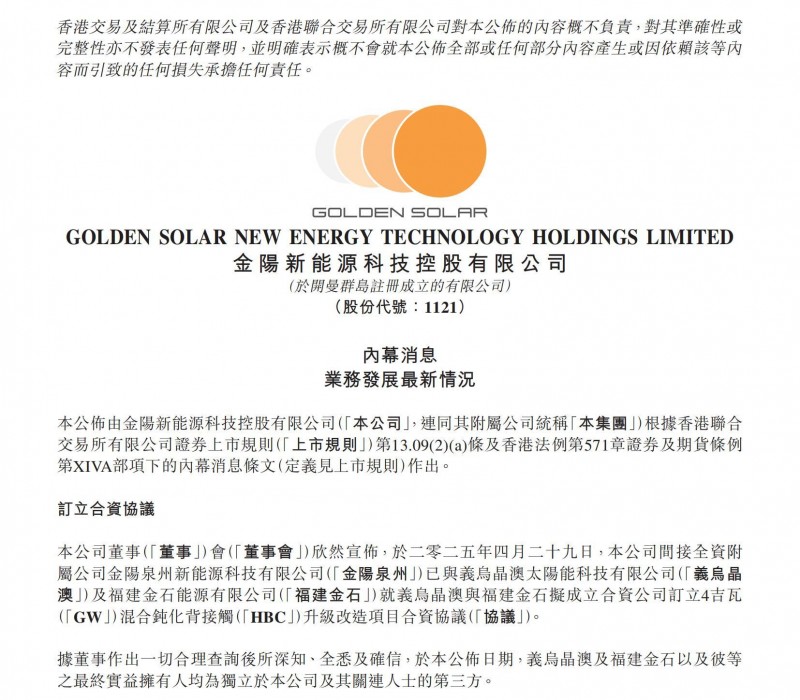 近日,金陽新能源發布公告稱,公司間接全資附屬公司金陽泉州新能源科技有限公司(金陽泉州)已與義烏晶澳太陽能科技有限公司(義烏晶澳)及福建金石能源有限公司(福建金石)就義烏晶澳與福建金石擬成立合資公司訂立4GW混合鈍化背接觸(HBC)升級改造項目合資協議。