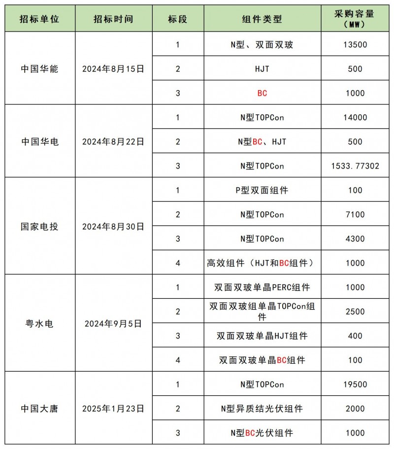 除了陣營的快速擴容,2024年8月,中國華能集團有限公司2024年光伏組件(第二批)框架協議采購項目正式公開招標,首次將BC組件納入集采標段,成為BC技術路線打開國內集中式光伏電站市場的重要節點。在此之后,華電、國家電投、粵水電、大唐等大型電力投資集團在光伏組件招標中均為N型BC技術單獨設立標段。