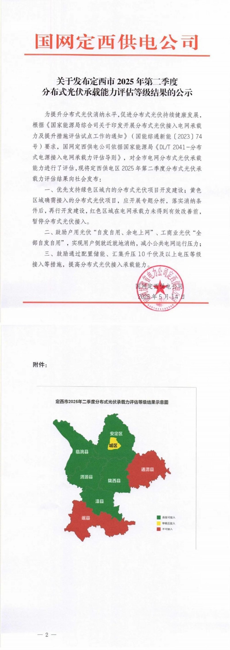 5月14日,甘肅省定西市發改委公示了定西市2025年第二季度分布式光伏承載能力評估等級結果
