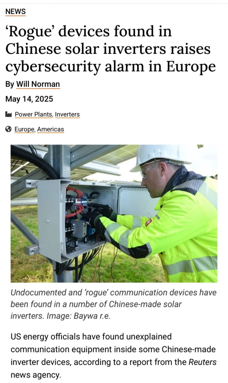 據路透社近期報道,中國太陽能逆變器中發現“惡意”設備引發歐洲網絡安全警報。