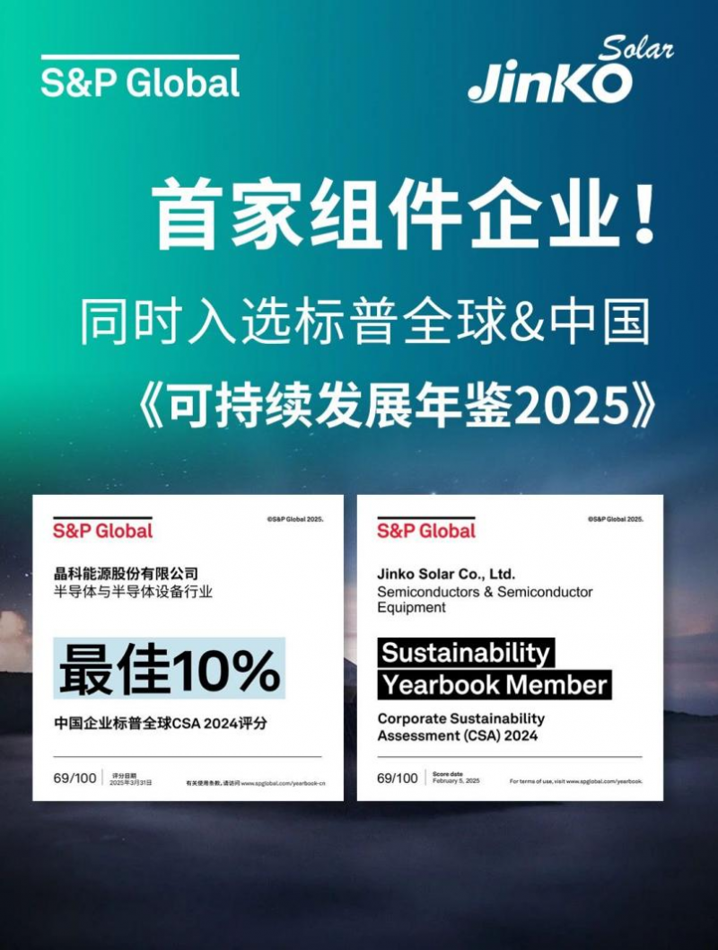 《可持續發展年鑒(中國版)》旨在識別并表彰在各自行業中展現出可持續發展優勢的中國企業。截至2025年3月31日,共有1,600余家獲得2024企業可持續發展評估(CSA)的企業被考慮納入《可持續發展年鑒(中國版)2025》,最終160余家脫穎而出,入選《可持續發展年鑒(中國版)2025》。此次晶科能源能夠成功入選,體現了其在環境管理、社會責任履行以及公司治理等多維度的突出表現,也彰顯了其在技術創新、清潔能源解決方案提供以及應對氣候變化等方面的杰出貢獻。