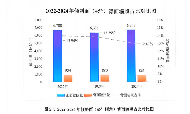 根據大慶實證基地2024年氣象環境實測數據顯示,自2022年-2024年,傾斜面三年平均背面輻照占比為13.5%,2024年全年傾斜面背面輻照占比達12.87%,這意味著組件雙面率對發電量增益的重要性。