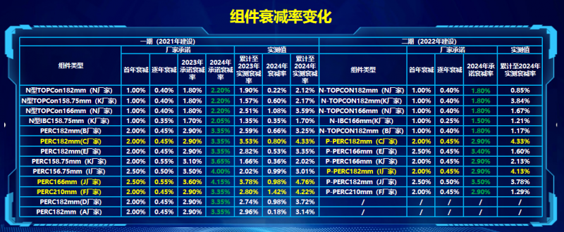 大部分廠家實測衰減率滿足廠家承諾值,但存在部分廠家衰減率較大;相同技術不同廠家衰減率存在差異,最大差異達到2%以上;二期組件轉化效率有所提升,單位兆瓦發電量高于一期0.6%左右。
