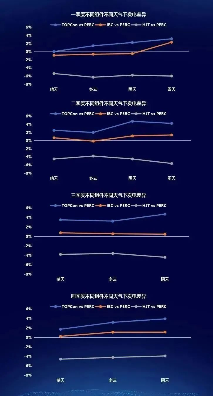 實證數據顯示,不同技術類型組件較PERC組件發電增益在不同典型天氣下差異較大,TOPCon組件在陰天、雨天和雪天條件下發電增益較高;受環境溫度影響,TOPCon組件在冬季晴天條件下較PERC組件增益降低。