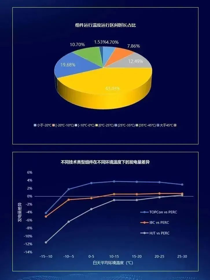 寒溫帶氣候下組件運行工況處在溫度較低的水平,組件運行溫度低于25℃運行時長占比為68.09%。溫度對組件發電量影響較大,環境溫度>-10℃,TOPcon技術組件發電量高于PERC,曲線圖可以闡述在多個氣候帶設立實證實驗項目的意義,研究不同典型氣候區域氣象特征對光伏產品、系統的影響。