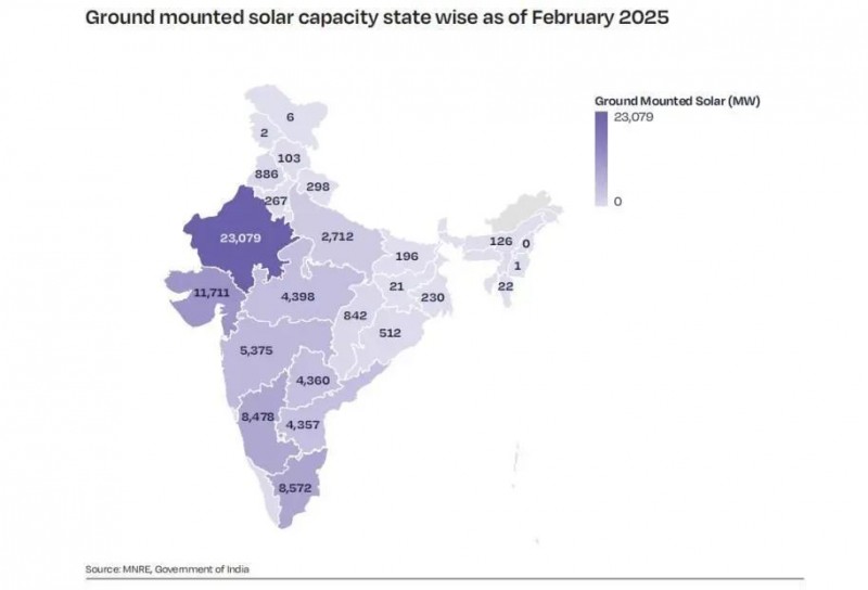 2024年,印度大型地面光伏電站裝機(jī)容量為78.5GW,占光伏總裝機(jī)量的78.5%。安裝量前四名的邦分別是拉賈斯坦邦(23.079GW)、古吉拉特邦(11.711GW)、泰米爾納德邦(8.572GW)、卡納塔克邦(8.478GW),主要集中在印度的西部和南部。