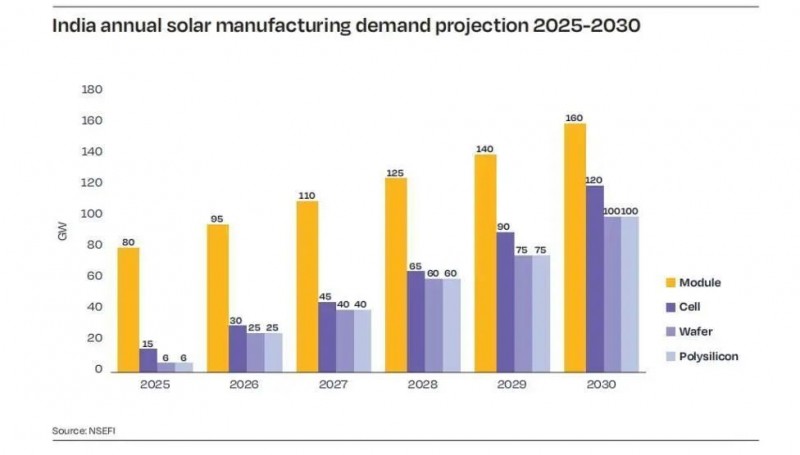 印度國家太陽能聯(lián)合會(NSEFI)對光伏制造四大核心環(huán)節(jié)的產(chǎn)能增長進(jìn)行了預(yù)測:組件產(chǎn)能將從2025年的80GW大幅提升至2030年的160GW,保持穩(wěn)定擴(kuò)張;電池片預(yù)計(jì)從15GW躍升至120GW,呈現(xiàn)強(qiáng)勁增長態(tài)勢。