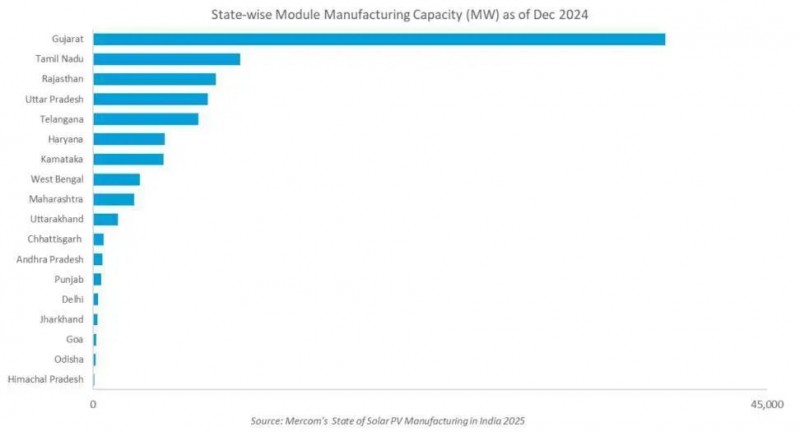 Mercom發(fā)布的《2025年印度太陽能光伏制造業(yè)現(xiàn)狀》數(shù)據(jù)顯示,截至2024年12月31日,印度光伏組件產(chǎn)能新增25.3GW,達(dá)到90.9GW,電池產(chǎn)能新增11.6GW。這種產(chǎn)能擴(kuò)張?jiān)诘乩矸植忌铣尸F(xiàn)高度集中的特點(diǎn),古吉拉特邦聚集了全國42%的組件產(chǎn)能和近38%的電池產(chǎn)能,在各邦中處于絕對領(lǐng)先地位。