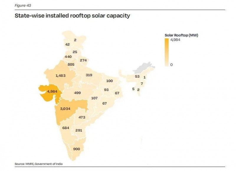 在區(qū)域分布上,屋頂光伏裝機(jī)量排名前三的邦分別是古吉拉特邦(4.984GW)、馬哈拉施特拉邦(3.034GW)、拉賈斯坦邦(1.483GW)。