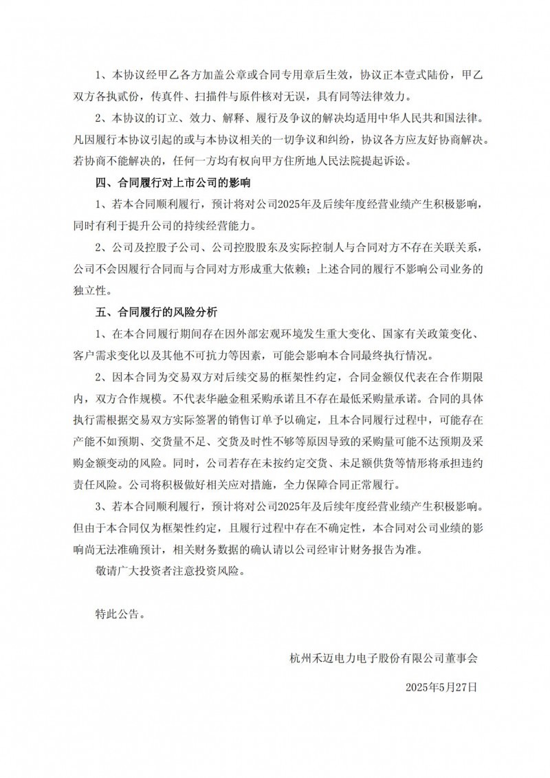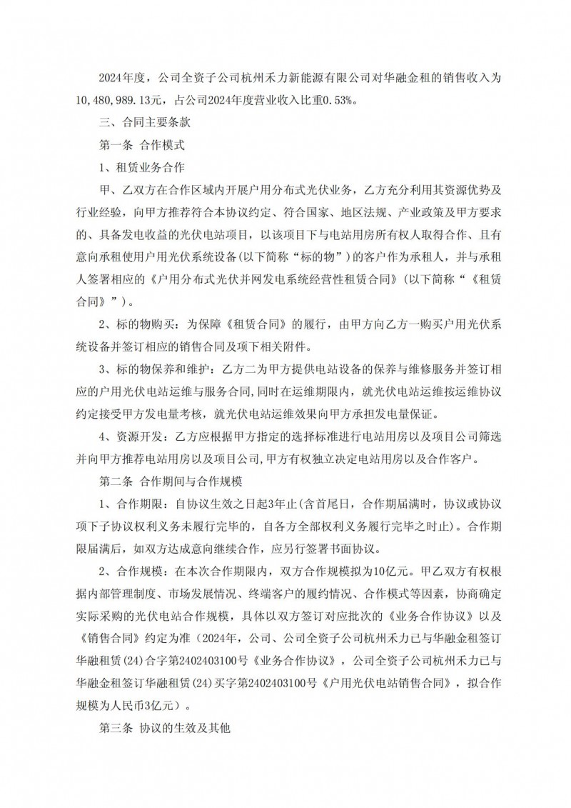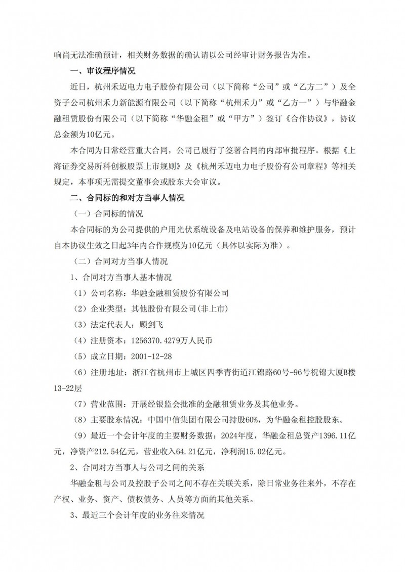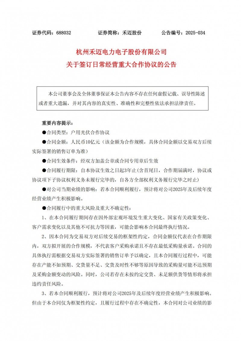 日前,禾邁股份發布公告,禾邁股份及全資子公司與華融金融租賃股份有限公司簽訂合作協議,本合同標的為公司提供的戶用光伏系統設備及電站設備的保養和維護服務,預計自本協議生效之日起3年內合作規模為10億元(具體以實際為準)。具體金額以實際簽署的銷售訂單為準。該合同為公司日常經營重大合同,預計將對公司2025年及后續年度經營業績產生積極影響。