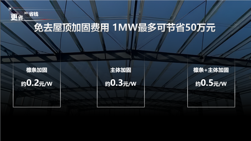 省加固成本:老舊屋頂常規(guī)加固成本達0.5元/W(萬平方米約50萬元),部分廠房因無法內(nèi)部施工被迫放棄。Hi-MO X10憑借24.8%轉(zhuǎn)換效率(單塊功率提升140W),使BOS成本降低33%。