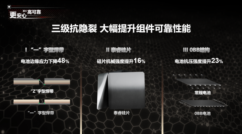 技術(shù)護航:HPBC 2.0技術(shù)以泰睿硅片提升機械強度16%,結(jié)合一字型焊帶(電池邊緣應力降48%)與0BB結(jié)構(gòu)(抗壓能力提升23%),保障長期可靠性。