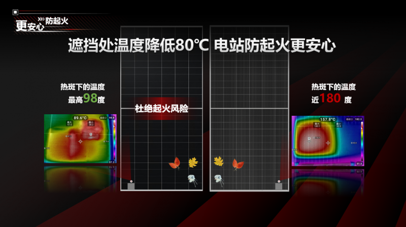 防起火:局部遮擋下熱斑溫度僅80℃+(TOPCon組件達180℃+),大幅降低起火風險。