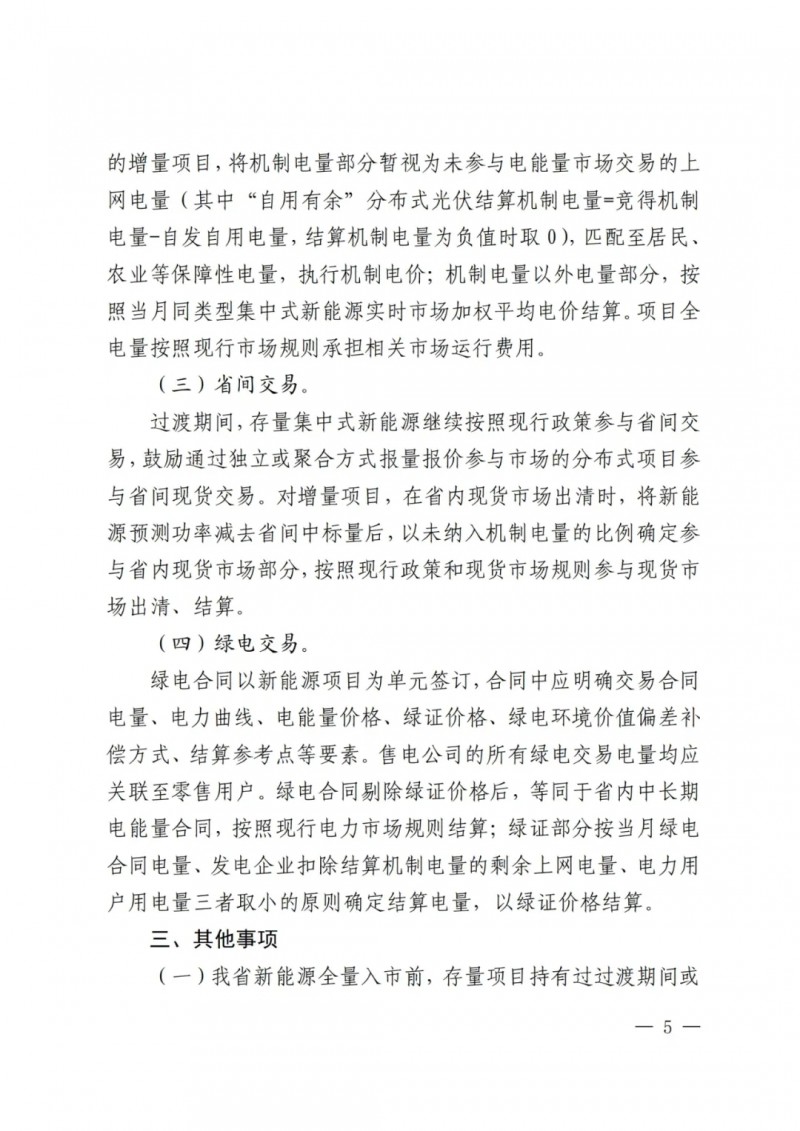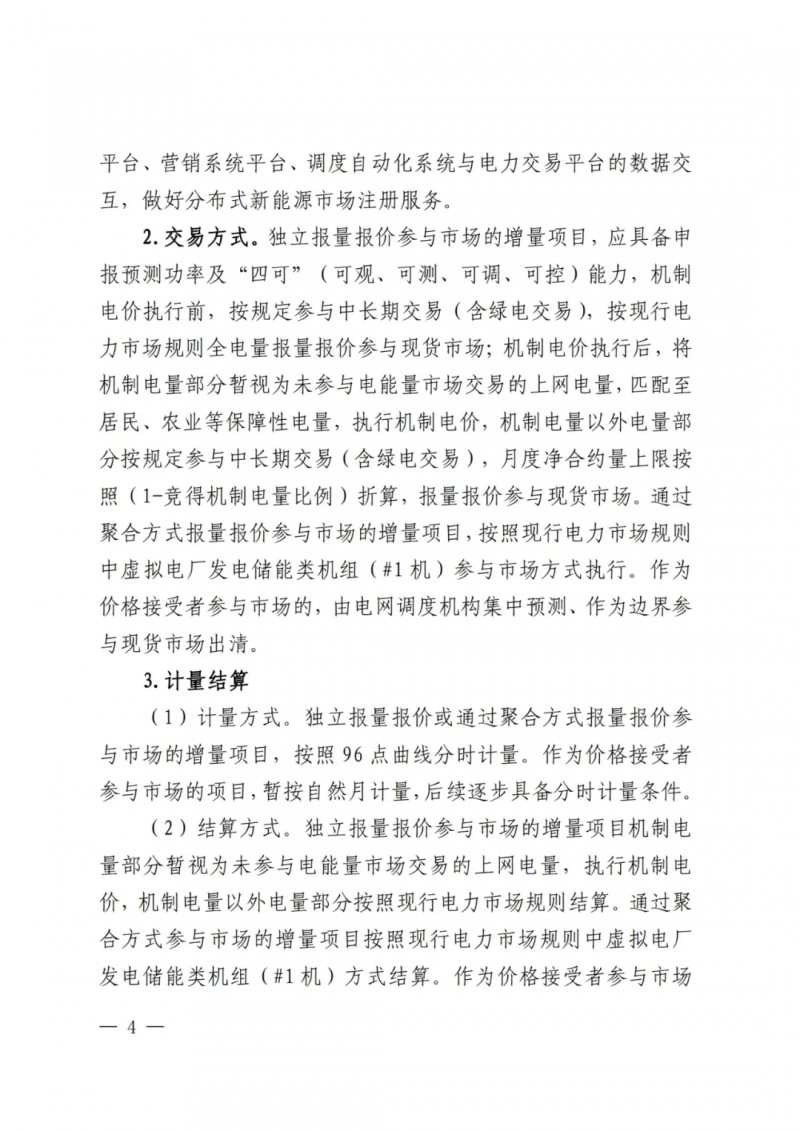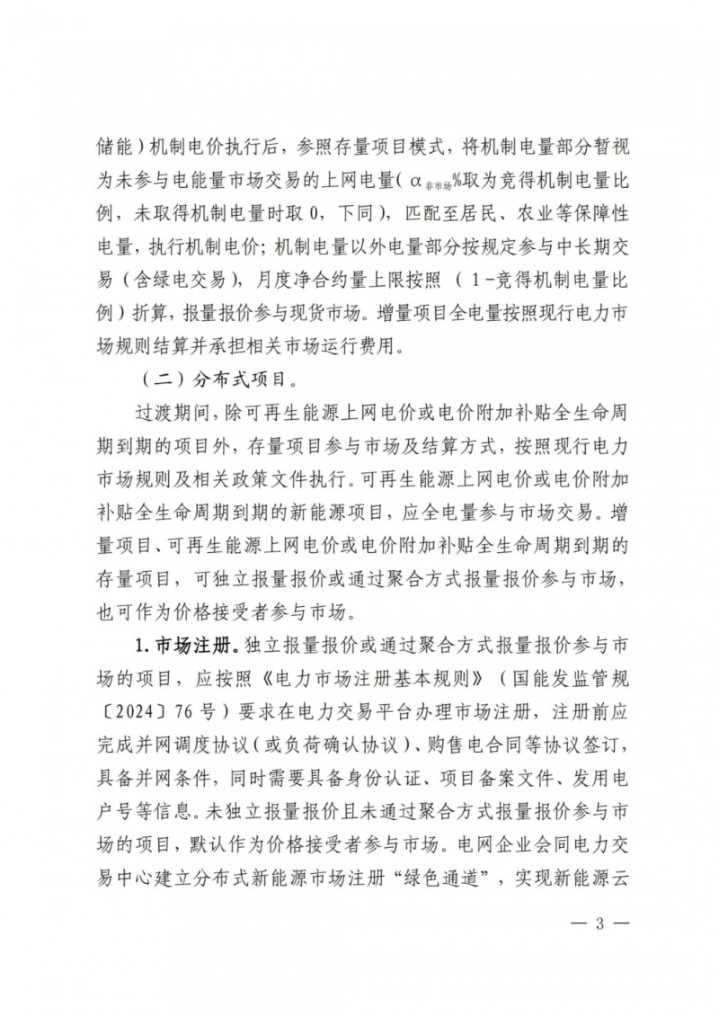 在具體的參與市場交易方面,存量項目(含配建儲能)按照現行電力市場規則規定執行;增量項目(含配建儲能)在機制電價執行前,按規定參與中長期交易(含綠電交易),按現行電力市場規則全電量報量報價參與現貨市場。
