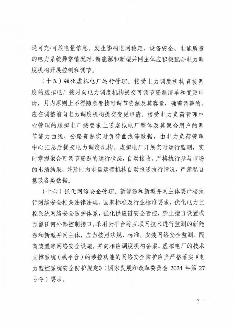 在并網(wǎng)運行管理中,文件強調,電化學儲能新能源和新型并網(wǎng)主體還應上送可充/可放電量信息。發(fā)生影響電網(wǎng)穩(wěn)定、設備安全、電能質量的電力系統(tǒng)異常情況時,應積極配合電力調度機構開展控制和調節(jié)。虛擬電廠開展實時運行監(jiān)測,實施掌握聚合可調節(jié)資源的運行狀態(tài),自動接收、嚴格執(zhí)行參與市場的出清結果,并及時向市場運營機構自動報送執(zhí)行情況,嚴謹私自篡改各類數(shù)據(jù)。