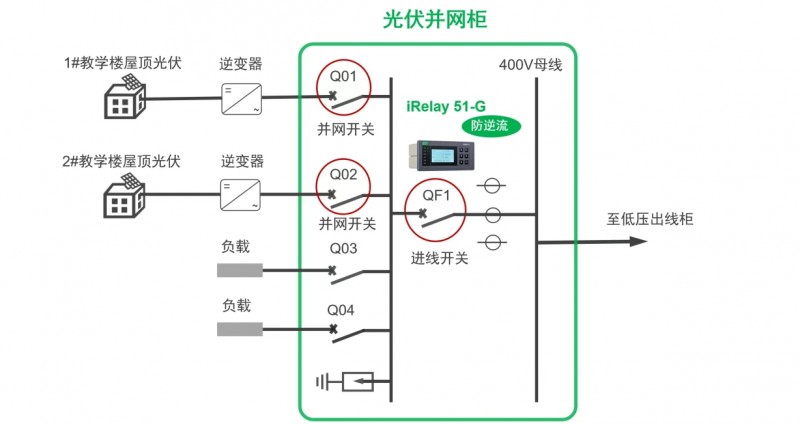 在10kV以下的光伏發(fā)電系統(tǒng)中,推薦在光伏并網(wǎng)柜安裝iRelay 51-G并投入逆功率保護(hù)功能。當(dāng)并網(wǎng)開關(guān)出現(xiàn)逆流,iRelay 51-G監(jiān)測到逆功率后觸發(fā)保護(hù)動作,選擇跳開Q01并網(wǎng)開關(guān),降低發(fā)電功率,保證全部發(fā)電自發(fā)自用;如果iRelay 51-G再次監(jiān)測到逆功率,便會觸發(fā)保護(hù)動作跳開Q02并網(wǎng)開關(guān),避免發(fā)生電網(wǎng)逆流。