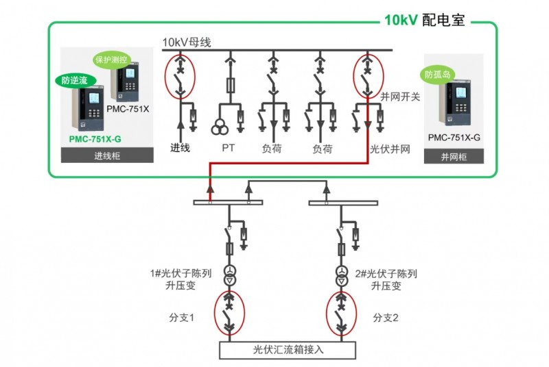 在10kV及以上光伏發(fā)電系統(tǒng)中,推薦在進(jìn)線柜安裝PMC-751X-G并投入逆功率保護(hù)功能,當(dāng)進(jìn)線柜出現(xiàn)逆流,PMC-751X-G監(jiān)測到逆功率后觸發(fā)保護(hù)動作,跳開分支1或分支2斷路器,降低光伏發(fā)電功率,保證全部發(fā)電自發(fā)自用;若PMC-751X-G再次監(jiān)測到逆功率,便會跳開光伏并網(wǎng)開關(guān),避免發(fā)生電網(wǎng)逆流。