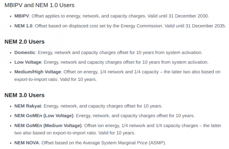 而凈計量計劃(NEM)中,1.0版本用戶將享受抵扣優惠至2035年底,2.0與3.0版本用戶從并網之日起可享受10年優惠。基于確保所有電力消費者獲得"公平"待遇的標準,馬來西亞政府將每年核算凈計量電價費率。