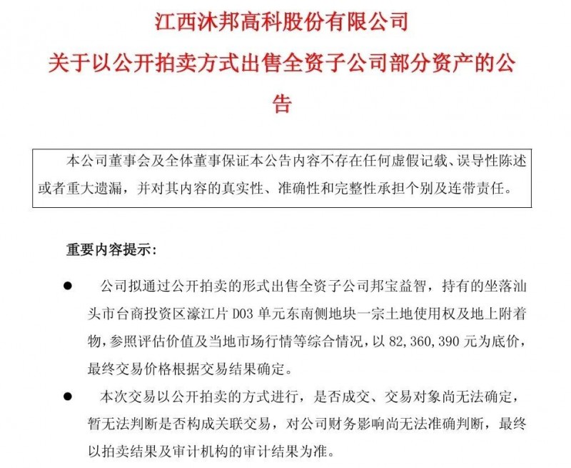 就在消息發布的兩天前,這家跨界光伏的玩具大佬,已經釋放出“賣身自救”的明確信號:公司擬通過公開拍賣方式,出售全資子公司邦寶益智名下的一宗土地及地上建筑。
