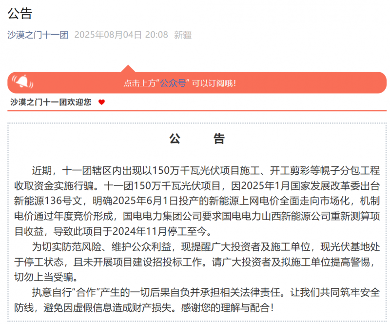 8月4日,沙漠之門十一團公眾號發布辟謠公告,稱十一團轄區內出現以150萬千瓦光伏項目施工、開工剪彩等幌子分包工程收取資金實施行騙。