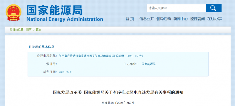此前,綠電直連一直停留在地方試點,直到今年5月,國家發改委、國家能源局聯合出臺《關于有序推動綠電直連發展有關事項的通知》(發改能源〔2025〕650號),首次從國家層面明確“綠電直連”這一新能源供用電新模式的規則框架。