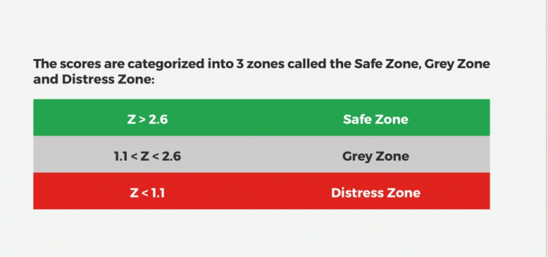 關(guān)于Altman z 分?jǐn)?shù)的解釋:如果 Altman z 分?jǐn)?shù)公式的結(jié)果低于1.1,則該公司屬于財(cái)務(wù)困境區(qū),分?jǐn)?shù)高于2.6的公司處于安全區(qū),表明它們財(cái)務(wù)穩(wěn)定。