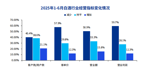 因為,除去“禁酒令”這一外部環(huán)境因素之外,真正讓壓力顯現(xiàn)的,是內部消費結構轉型以及行業(yè)競爭加劇,讓白酒行業(yè)已步入存量競爭時代,增長速度放緩。據中國酒業(yè)協(xié)會聯(lián)合畢馬威此前發(fā)布的《2025中國白酒市場中期研究報告》,今年上半年,酒類生產企業(yè)和經銷商的客戶數、客單價、營業(yè)額和營業(yè)利潤的減少比例均高于增加比例,其中營業(yè)利潤負面情況最為顯著,利潤率有所減少的企業(yè)占比高達59.7%。