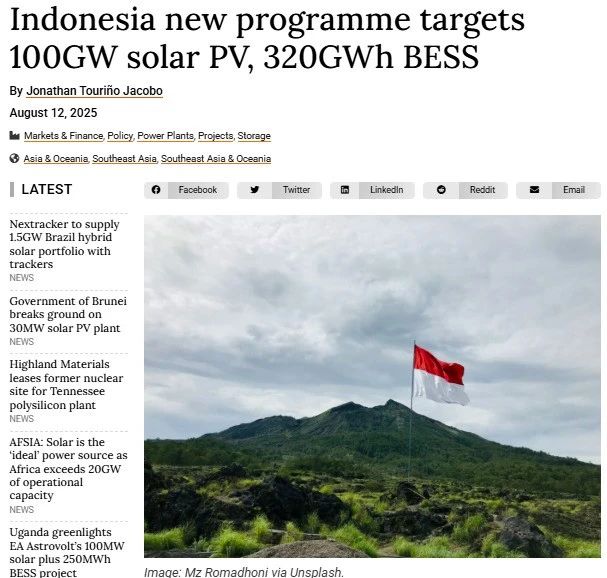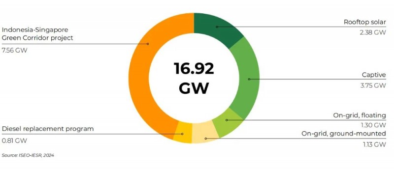 兩個月前,印尼政府批準(zhǔn)了一項計劃,計劃到2034年增加42.6GW的可再生能源裝機容量和10.3GW的儲能容量,以支持該國國有電力公司。其中,太陽能光伏將是主力,規(guī)劃裝機達17.1GW。