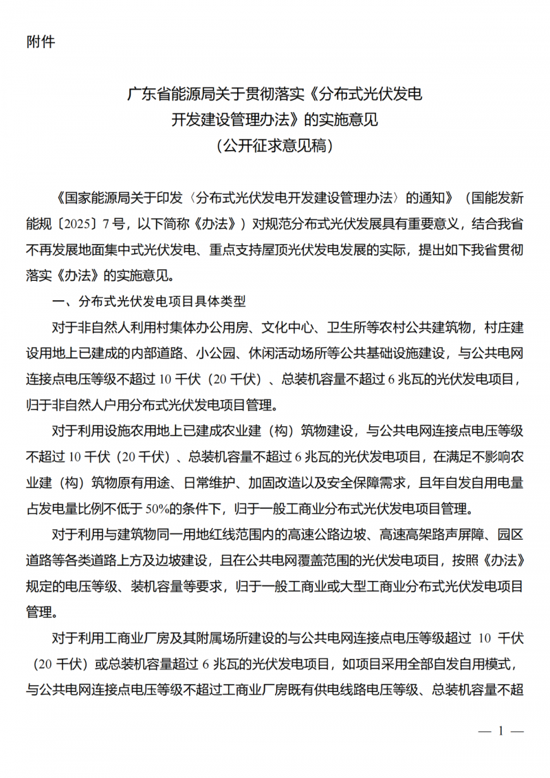 附件:廣東省能源局關于貫徹落實《分布式光伏發電開發建設管理設管理辦法》的實施意見(公開征求意見稿)