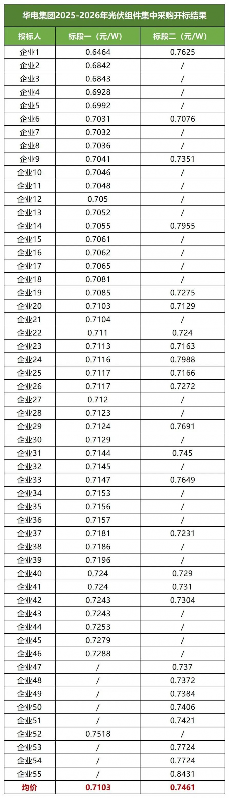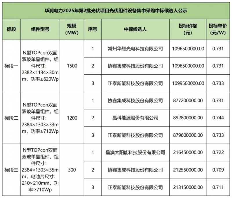 8月18日開標的華潤3GW光伏組件集采同樣如此,三個標段均價均都在0.7元/W以上,顯著高于當前市場水平。根據此前發布的中標候選人公示,常州華耀光電、協鑫、晶澳、晶科、正泰五家企業入圍,投標單價0.709~0.744元/W。
