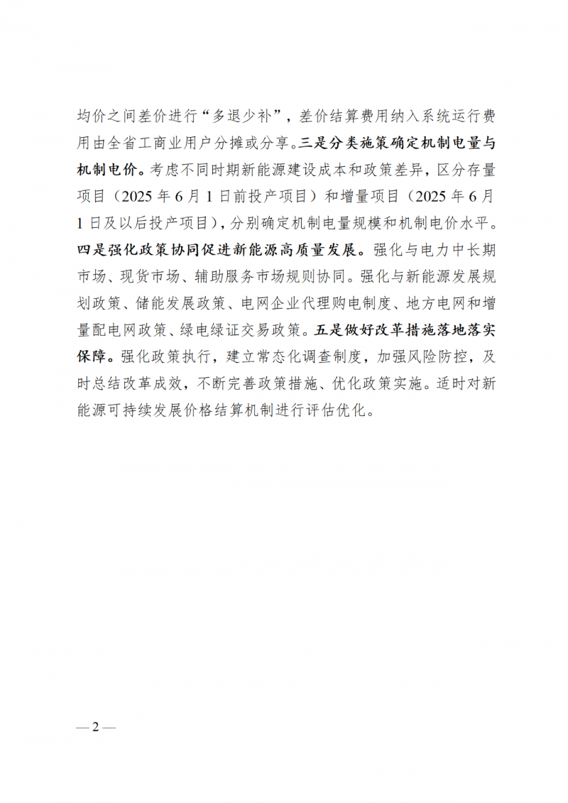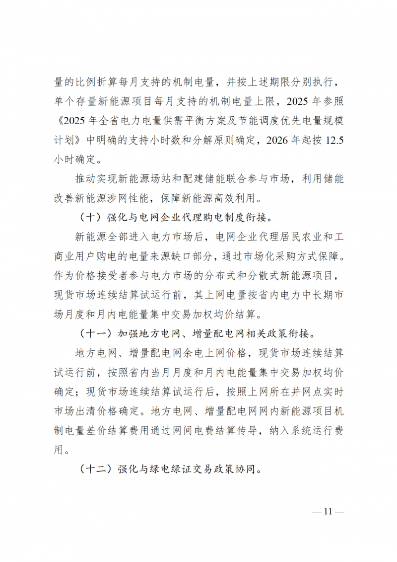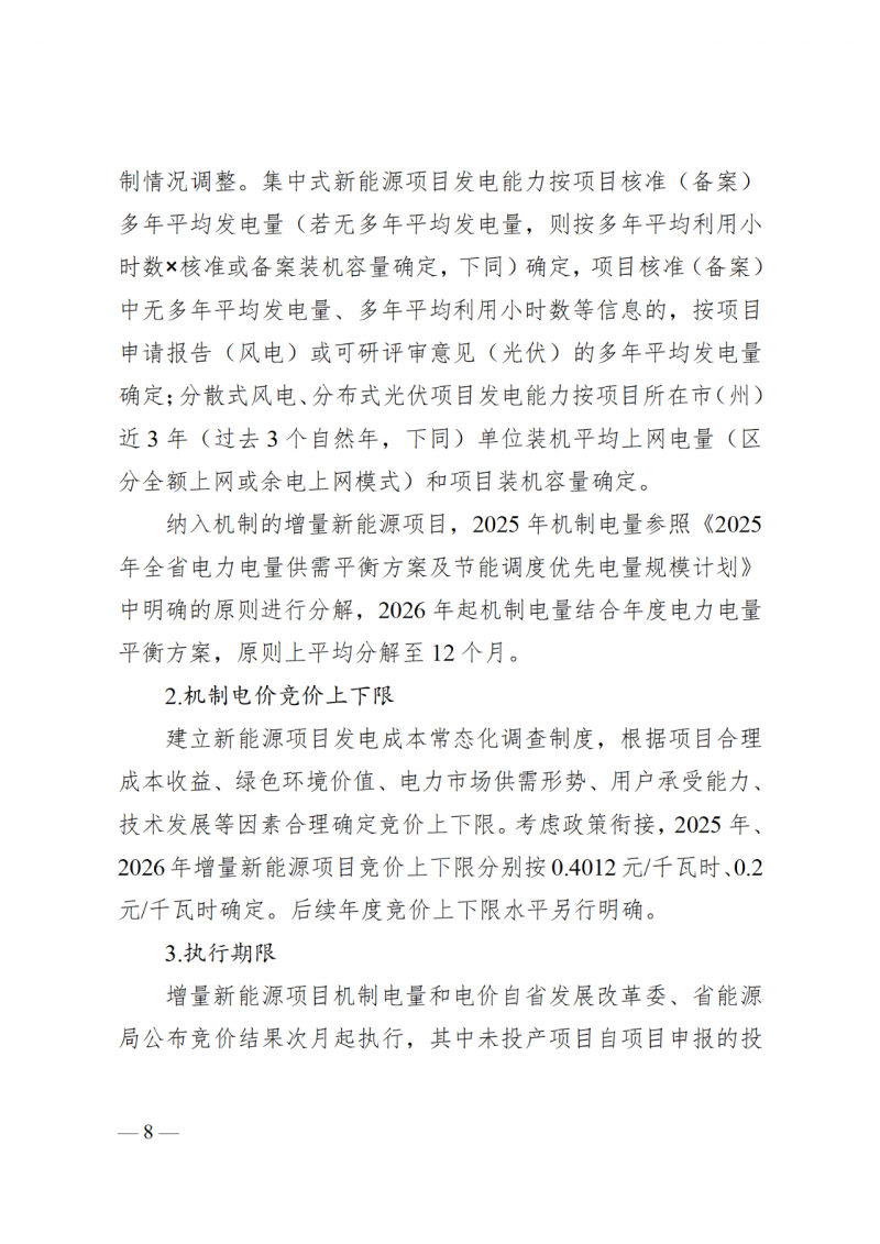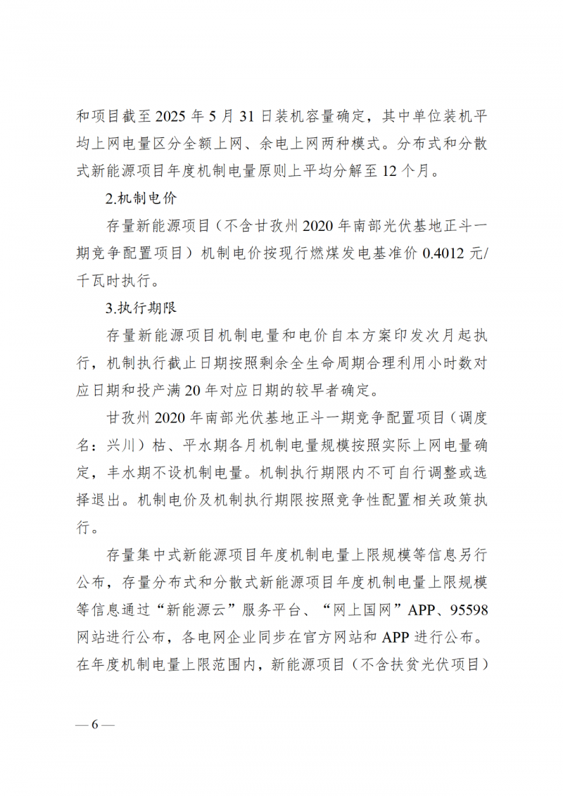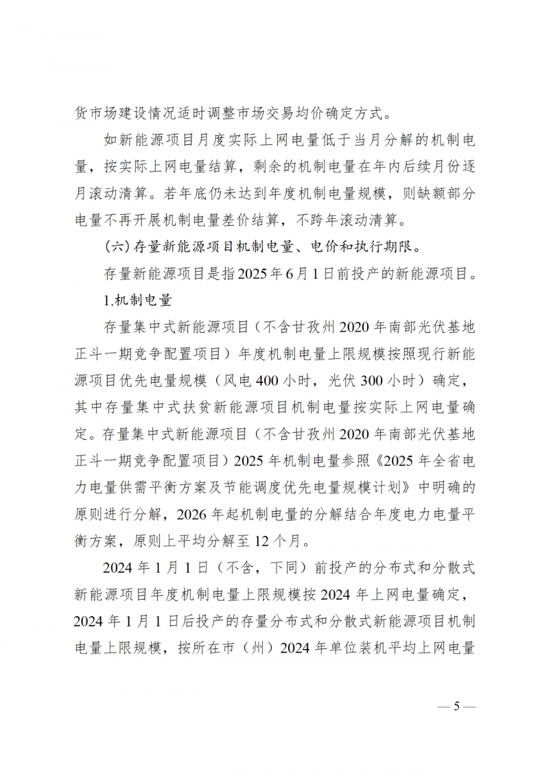 機(jī)制電量:存量集中式新能源項(xiàng)目(不含甘孜州2020年南部光伏基地正斗一期競(jìng)爭(zhēng)配置項(xiàng)目)年度機(jī)制電量上限規(guī)模按照現(xiàn)行新能源項(xiàng)目?jī)?yōu)先電量規(guī)模(風(fēng)電400小時(shí),光伏300小時(shí))確定,其中存量集中式扶貧新能源項(xiàng)目機(jī)制電量按實(shí)際上網(wǎng)電量確定。存量集中式新能源項(xiàng)目(不含甘孜州2020年南部光伏基地正斗一期競(jìng)爭(zhēng)配置項(xiàng)目)2025年機(jī)制電量參照《2025年全省電力電量供需平衡方案及節(jié)能調(diào)度優(yōu)先電量規(guī)模計(jì)劃》中明確的原則進(jìn)行分解,2026年起機(jī)制電量的分解結(jié)合年度電力電量平衡方案,原則上平均分解至12個(gè)月。
