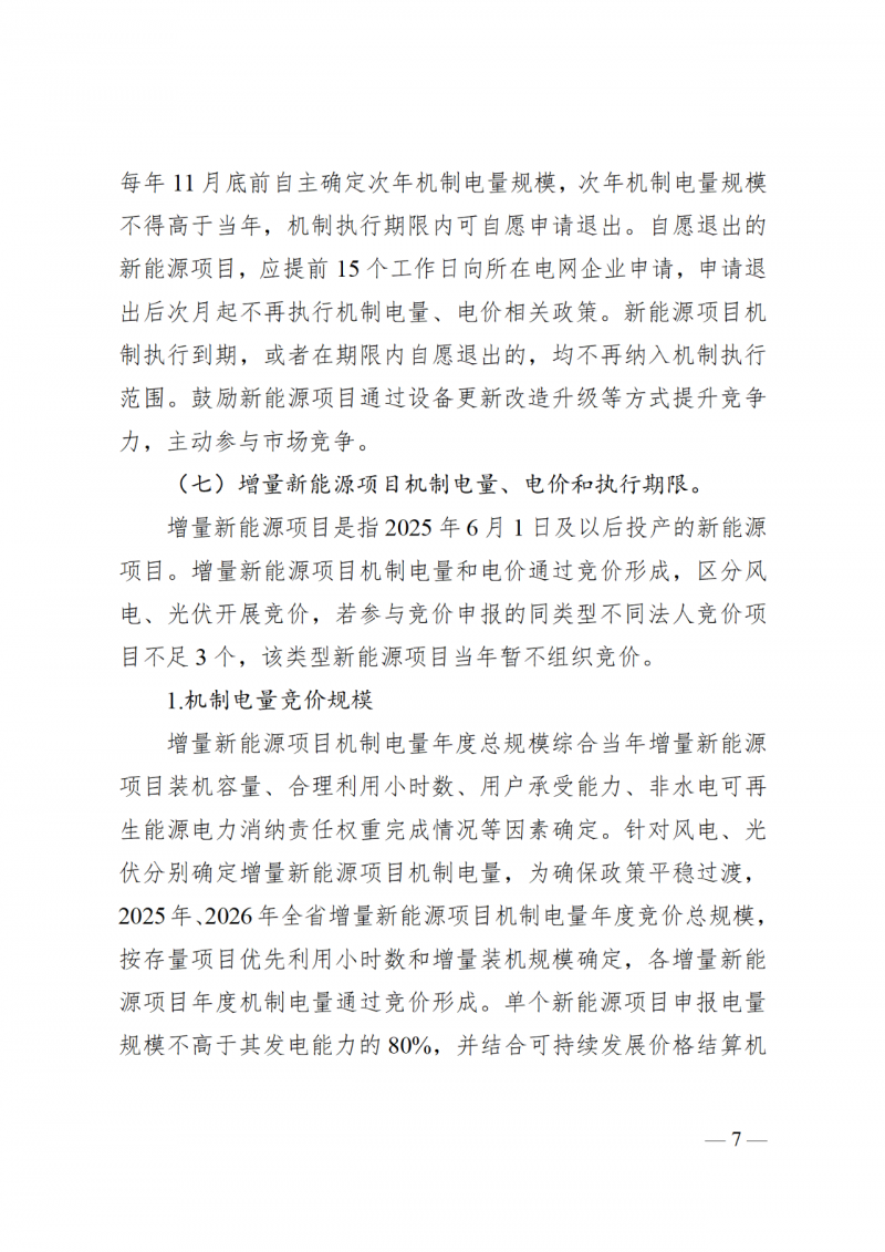 機(jī)制電量:針對(duì)風(fēng)電、光伏分別確定增量新能源項(xiàng)目機(jī)制電量,為確保政策平穩(wěn)過(guò)渡,2025年、2026年全省增量新能源項(xiàng)目機(jī)制電量年度競(jìng)價(jià)總規(guī)模,按存量項(xiàng)目?jī)?yōu)先利用小時(shí)數(shù)和增量裝機(jī)規(guī)模確定,各增量新能源項(xiàng)目年度機(jī)制電量通過(guò)競(jìng)價(jià)形成。單個(gè)新能源項(xiàng)目申報(bào)電量規(guī)模不高于其發(fā)電能力的80%,并結(jié)合可持續(xù)發(fā)展價(jià)格結(jié)算機(jī)制情況調(diào)整。