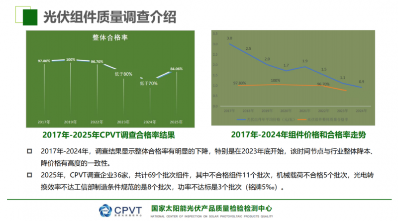 CPVT光伏產(chǎn)品質(zhì)量抽查結(jié)果顯示,2019-2024年,光伏組件整體合格率已由100%下降至62.9%,五年內(nèi)下降了近40個百分點(diǎn)。且在2025年36家企業(yè)共計(jì)69個批次組件抽檢中,不合格率近16%。作為光伏組件的原材料,玻璃、邊框、焊帶、膠膜、接線盒也都存在不同程度的質(zhì)量問題。