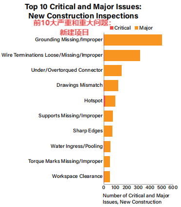 報告指出,質(zhì)量問題在EPC領(lǐng)域普遍存在。報告分析的項(xiàng)目中,85%存在需要緊急糾正措施的重大問題,7%的項(xiàng)目存在需要立即斷電(部分或全部)并于當(dāng)天進(jìn)行補(bǔ)救的嚴(yán)重問題。此外,HelioVolta分別在80%和83%的項(xiàng)目中觀察到與接線和連接器相關(guān)的問題。