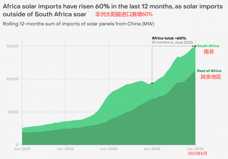 據(jù)全球能源智庫Ember報(bào)告顯示,在截至2025年6月的12個(gè)月中,非洲太陽能電池板進(jìn)口量大幅攀升至15,032MW,創(chuàng)下歷史新高,較此前12個(gè)月的9,379MW激增60%。這一增長(zhǎng)背后,離不開中國(guó)企業(yè)在產(chǎn)品供應(yīng)、項(xiàng)目開發(fā)和系統(tǒng)集成等方面的持續(xù)助力。