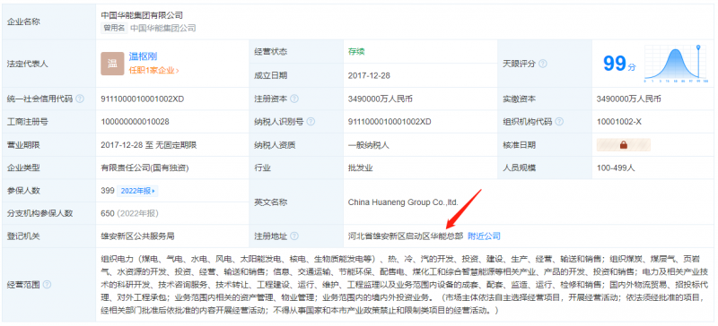 華能集團的工商信息注冊地址已變更為“河北省雄安新區啟動區華能總部”。
