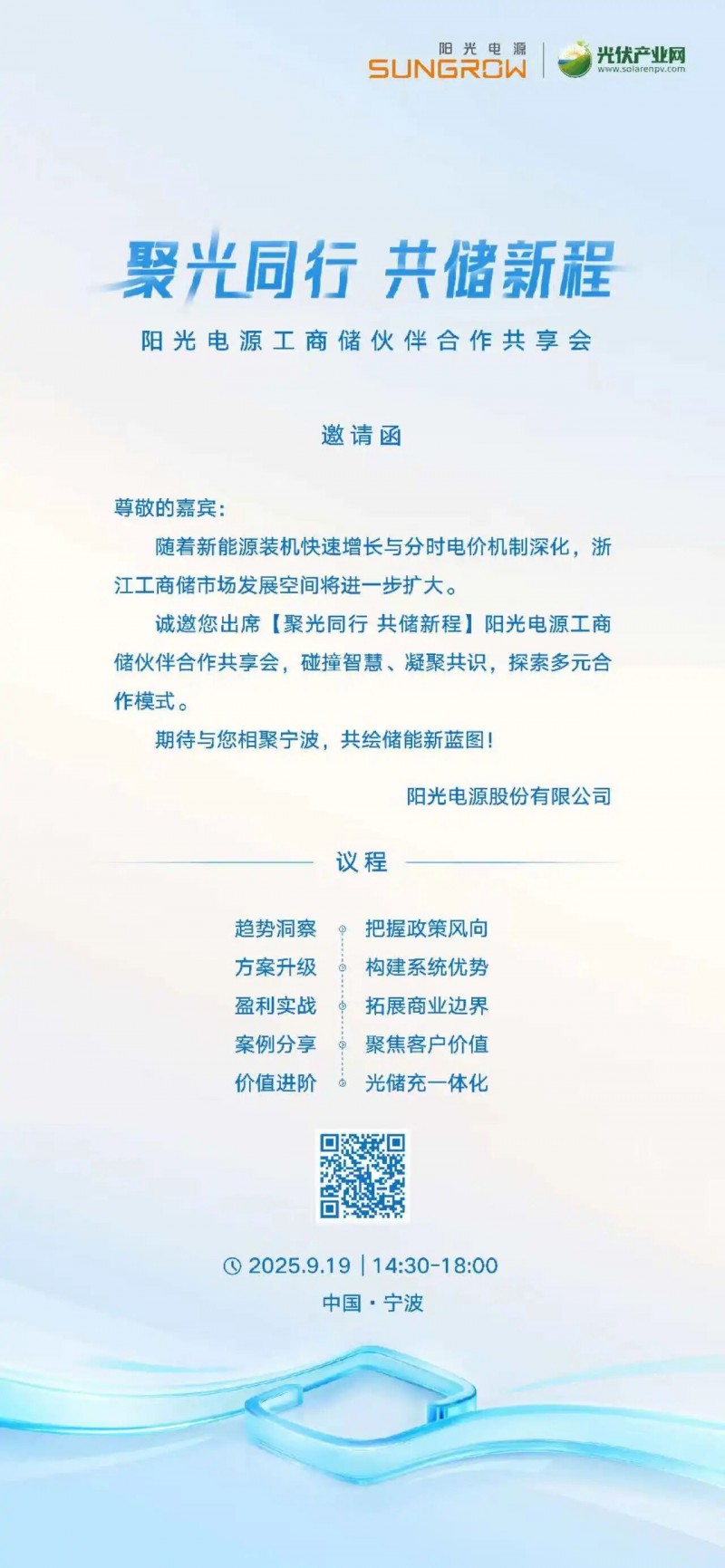 在“雙碳”目標引領下,浙江省作為全國工商業儲能發展的排頭兵,正以強勁的政策支持和活躍的市場生態推動儲能產業高速發展。乘此東風,9月19日,陽光電源將于中國·寧波舉辦“工商儲伙伴合作共享會”,聚焦政策解讀、市場機遇、技術方案與合作模式,目前報名通道已全面開啟,誠邀各位行業伙伴共拓儲能新藍海!