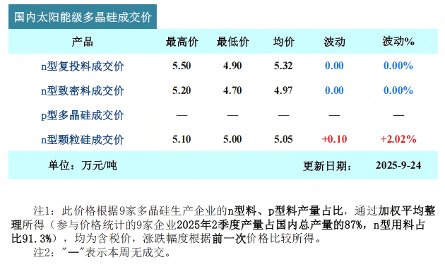 硅料方面:根據硅業(yè)分會9月24日公布的數據顯示,硅料價格已經突破5萬元/噸。其中,n型復投料成交均價已達到5.32萬元/噸,n型顆粒硅成交均價達到5.05萬元/噸。