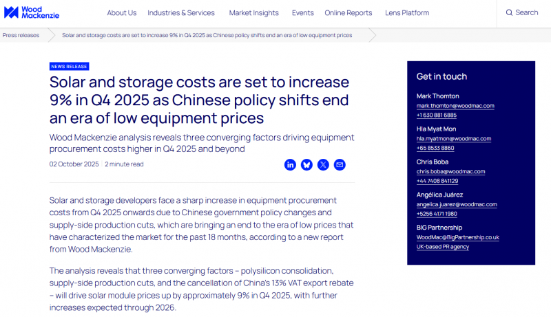 此外,自2025年第四季度起,中國預計將取消對太陽能電池組件和儲能出口的13%增值稅退稅,這將是第三個決定性因素。伍德麥肯茲解釋說,由于中國供應了全球超過80%的太陽能電池組件和90%的儲能用磷酸鐵鋰電池組,退稅的取消將推高全球基準價格。
