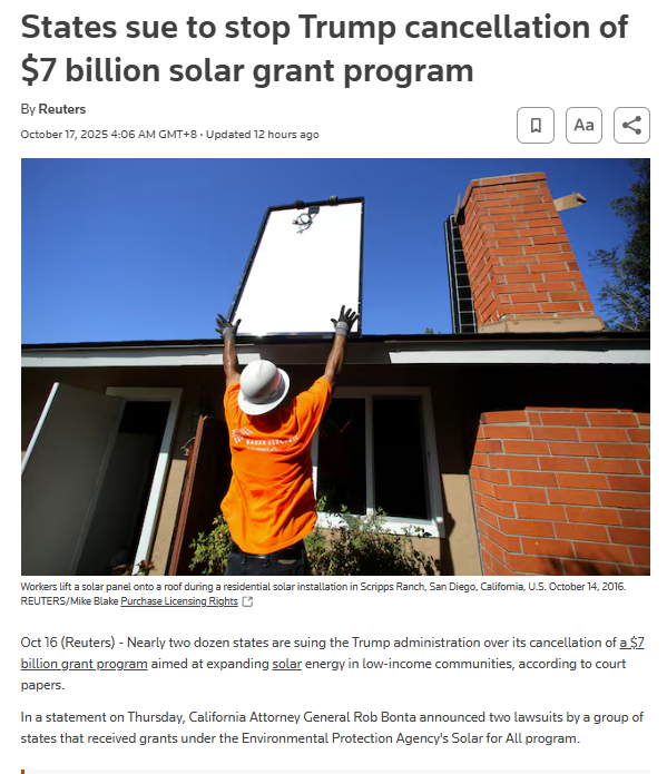如果順利實施,該計劃預計能為100萬美國家庭減少至少20%的電費,每年節省約3.5億美元。然而,今年8月7日,美國環保署署長李·澤爾丁突然宣布終止該計劃,并收回了已撥付資金的約90%。