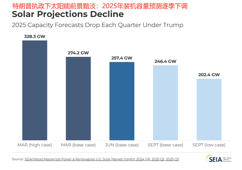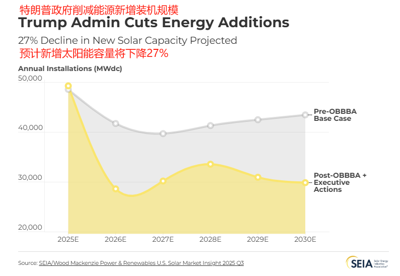 美國太陽能行業協會和伍德麥肯茲的預測顯示,特朗普政府的政策可能導致2026年至2030年間新增太陽能裝機容量下降27%。